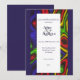 Este convite tem um fundo azul-marinho com um desenho ankara e outros acentos de cor, uma caixa retangular branca no centro e detalhes do casamento em topografia simples azul-marinho.