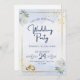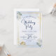 Um convite de casamento com cores calmas e atraentes e um design elegante em branco com flores claras, azuis e brancas e anéis de casamento. Faça este convite sua escolha ao escolher um convite para o casamento. É distinta e única.