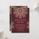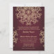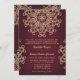 Um belo convite de casamento marrom burgundy e dourado com um padrão de medalhão de sari ornamental exótico inspirado na Índia COM UM DESIGN DE EXPLOSÃO SOLAR DE FLOR E LÓTUS. Este convite de casamento em estilo indiano moderno e elegante é perfeito para qualquer ocasião formal COM UM TEMA DE NOITES ÁRABES, ALADIM, MARROQUINO OU INDONÉSIO DA ÁSIA ORIENTAL. Projetado por Chrissy H. Studios, LLC. Todos os direitos reservados.