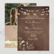 Este elegante convite de casamento tudo-em-um apresenta um fundo de madeira rústica com luzes de corda brilhantes, esboços florais dourados românticos e um cartão de resposta correspondente com um código QR personalizado. Os convidados podem facilmente escanear para responder, detalhes do casamento ou seu site. Uma escolha quente e aconchegante para casamentos rústicos, de celeiro, boho ou outono — simples de enviar, lindo de receber.