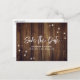 Cartão postal simples de guardar a data do casamento com caligrafia moderna rústica ideal para uma festa de casamento com tema rústico. Este cartão postal de guardar a data do casamento rústico apresenta madeira de celeiro adornada com luzes cintilantes.