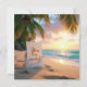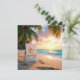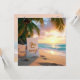Uma cena de praia no pôr do sol mostra um convite de casamento enfiado na areia sob uma palmeira. Todo o texto pode ser alterado.