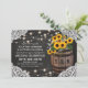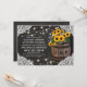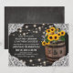 Convites de casamento country elegantes com um fundo rústico de quadro-negro preto, decoração de canto de renda de noiva, luzes cintilantes, girassóis amarelos dourados de verão, um barril de madeira de vinícola com suas iniciais e um pedaço de corda amarrada.