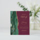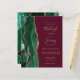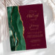 A borda esquerda deste elegante convite de casamento moderno apresenta uma esmeralda verde aquarela agate borda com falsa brilho dourado. O texto personalizável combina manuscritos dourados, copperplate e fontes itálicas em um fundo vermelho arrojado. O verso apresenta um design emerald verde e dourado.