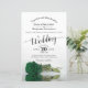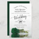 Este belo orçamento ou convite para casamento de baratos apresenta uma design romântica com um solteiro verde-esmeralda de longa estante que se põe ao seu lado e reflete numa piscina de água. A tipografia apresenta caligrafia de script e um layout sofisticado. A parte de trás é uma esmeralda profunda marmoreada ou uma cor verde da floresta. Uma maravilhosa maneira de convidar seus amigos e família para compartilhar sua alegria em seu dia especial.