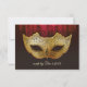 Convite de Casamento Mascarado com Farfalha Dourada. Um cartão de RSVP de máscara de mascarada sofisticada e elegante para que todos os seus convidados saibam o status de sua presença em seu casamento. A máscara é apresentada aqui em tons dourados com floreios pretos sobre ela e um fundo com floreios elegantes em tons dourados e preto.