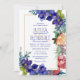 Disposição floral de aquarelas de flores azuis/roxas profundas complementadas com flores vermelhas com uma estrutura retangular dourada. Cor de água azul/púrpura completa. Todos os tipos são personalizáveis.