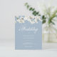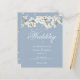 Convite de casamento com orçamento, com lindas flores brancas e detalhes em azul desbotado. As flores delicadas enquadram as informações do casamento em letras brancas sobre o fundo azul. O verso tem pétalas de flores espalhadas. Personalize com os detalhes do seu grande dia. Criado por Thisisnotme©