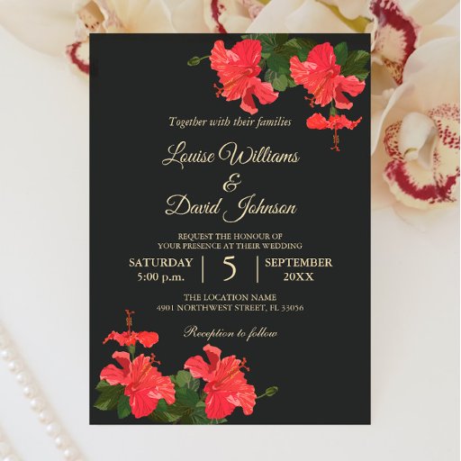 Convite de Casamento Flor de Hibisco Brilhante em fundo preto