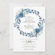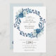 design do tema do casamento azul com flores azuis e brancas. O texto e as cores podem ser personalizados.