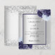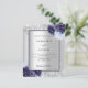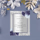 Fundo de aspecto fino prateado decorado com flores azuis e azuis-marinhos, flores e brilho fino prateado, brilhos. Personalize e adicione seus nomes e detalhes do casamento. Letras negras.