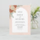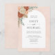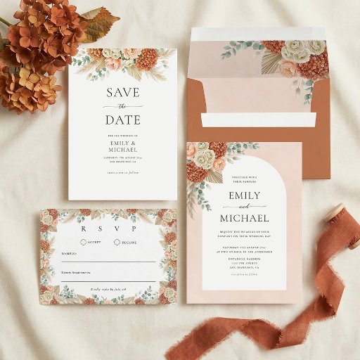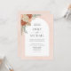 Anuncie seu casamento romântico com este convite moderno no estilo boho. Uma delicada moldura rosa bege emoldura uma composição de aquarela de hidrângeas terracota, peônias pêssego, ranúnculos marfim, grama pampas seca e folhagem de eucalipto verde-sage. Este design botânico terroso é perfeito para casais que planejam um casamento boêmio no final do verão ou outono.