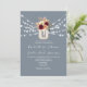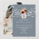 Romântico e rústico, este convite de casamento apresenta um fundo azul empoeirado com luzes de corda brancas, flores boho em burgundy e blush, e seu monograma personalizado. O verso inclui uma foto e código QR para RSVP ou detalhes do casamento — perfeito para casais modernos que buscam estilo e funcionalidade.