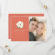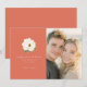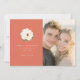 Este convite de save the date de casamento apresenta um layout dividido com um fundo coral quente à esquerda e um espaço reservado para foto com foco suave à direita. O design inclui uma grande ilustração de flor branca elegante centralizada acima de texto personalizável em uma mistura de fontes serifadas e sem serifa, criando um sentimento moderno e romântico. A paleta de cores combina coral suave com branco crocante e tons sutis de verde, realçando o clima alegre e comemorativo. Perfeito para casais que desejam anunciar suas próximas núpcias com estilo e simplicidade, este design equilibra elementos gráficos com charme fotográfico.