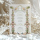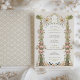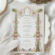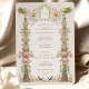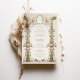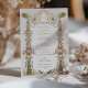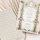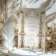 Este convite transporta hóspedes para uma festa de jardim vitoriano, repleta de figuras angélicas e abundância de flora. O rosa pastel macio de rosas florescentes é emparelhado com o verde sábio da folhagem, todos ancorados por um pedestal rico e joalhado que fala à opulência vitoriana. Os anjos envenenados com terras florais evocam um sentimento de celebração e graça, convidando convidados para um casamento que promete ser tão encantador quanto o próprio design. A paleta de cores é uma mistura sonhadora de blush, sábio e ouro antigo, perfeita para o casal que deseja um dia de casamento cheio de beleza e romance de uma era passada.