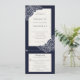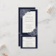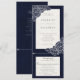 Combinação de convite de casamento com papoulas desenhadas à mão em branco sobre fundo texturizado azul-marinho.