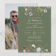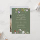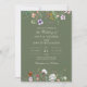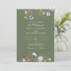Um convite de casamento em verde oliva terroso com flores silvestres coloridas dispostas em um agrupamento natural em estilo de prado. O layout botânico orgânico e o fundo quente em verde oliva criam uma atmosfera romântica de campo perfeita para casamentos rústicos em celeiros e ao ar livre.