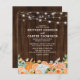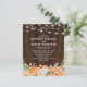 Convite para casamento outono de orçamento com um fundo de madeira rústico, luzes de cordas quic no quintal, elegantes flores de cor laranja e de jardim branco no outono, e um modelo de celebração de casamento que é fácil de personalizar.