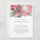 Belamente elegante e popular escolha nas flores para casamentos, este único design de convite para casamento apresenta um arranjo floral de cor d'água de flores e botões exóticos do Rei Protea. As cores incluem cor rosa claro e escuro, burgundy, lacre e cinza prateada. Edite o texto do exemplo com os detalhes do casamento. Pertencente a uma das mais antigas famílias de flores do mundo, a flor da Protea tem associações mitológicas de mudança e transformação. Simbolizando diversidade e coragem, as proteas-rei crescem abundantemente na África do Sul e na Austrália, assim como comercialmente no Havaí e na Califórnia. Estão na estação durante todo o outono, inverno e primavera. Eles fazem um belo sotaque aos buquês de casamento.