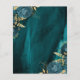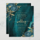 Este elegante convite para o casamento apresenta buquês florais azuis de cor azul saltados com verde folha de ouro em dois cantos, em uma imagem de fundo de um agate de cor de água lacrimogênea. O texto personalizável combina fontes de serifa, itálico e escrita manual douradas. O verso apresenta um chalé e um design de ouro e floral e agate.