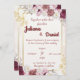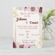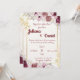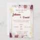 um design de convite de casamento clássico e elegante. Ele apresenta um fundo branco suave, texturizado ou bege claro que evoca uma sensação de formalidade tradicional. O ponto focal são os nomes estilizados do casal, renderizados em uma escrita elegante e caligráfica em cores profundas, tinto-de-vinho ou burgundy. Ao redor do texto central está uma borda de ilustrações florais de cor d'água. As flores, primariamente em tons de rosa, burguentos e brancas, são pintadas vagamente, dando um toque suave e romântico. O verde adiciona um toque de elegância natural. O efeito geral é de beleza refinada e romance eterno, adequado para uma celebração formal de casamento.