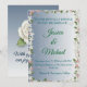 Este convite de casamento elegante apresenta um fundo sofisticado com gradiente de prata para azul, adornado com uma delicada borda floral branca e rosa. O design é acentuado com elementos sutis de bolhas ou gotas de orvalho, criando uma atmosfera fresca e sonhadora. Perfeito para casamentos de primavera ou verão, este convite combina caligrafia clássica com uma estética moderna. Completamente personalizável com os detalhes do seu casamento.