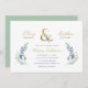 Barato personalizado de convites de casamento impressos personalizados com seus detalhes de evento. Este elegante design apresenta uma folha de alumínio falsa de ouro com delicados florais azuis e verdes de aquarelas sobre fundo branco. Use as ferramentas de design para personalizar o texto, editar as fontes e cores ou adicionar suas próprias fotos para criar um convite de casamento de classe e na moda.