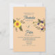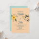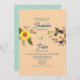 Boho, elegante, moderno, botânico, azul floral empoeirado e fuzz de pêssego convite para casamento com coração de corda de ouro, girassol, flores rosa-d'água, monograma de trás e roteiro caligrafia manuscrito.