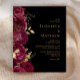 Este convite romântico de casamento floral mostra uma fronteira de flores de burgundy disparadas com folhas de folhas falsas de ouro. Os nomes do casal aparecem em fontes clássicas de serifa dourada, com o texto restante em itálico, em fundo preto.