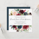 Nosso convite para o casamento do Radiant Bloom em um formato quadrado único enquadra seus detalhes de casamento com uma borda de cima e de baixo de flores pintadas de cor d'água em rosa-pincel, burgundy marsala e azul-marinho, entrelaçadas com folhagem verde de eucalipto.