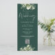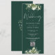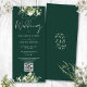 Um convite de casamento floral com vegetação com tipografia de caligrafia elegante e o código QR do site do seu casamento em um fundo verde esmeralda. Criado por Thisisnotme©