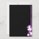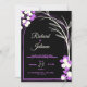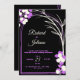 Um convite de casamento preto e branco com flores roxas e brancas em fundo preto. O convite apresenta os nomes da noiva e noiva, Richard e Juliana, juntamente com a data, hora e local do casamento.