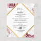 Elegante tema de casamento floral com flores rosas pinceladas e cor-de-rosa com um quadro geométrico de efeito ouro. A partir da coleção "Modern Floral and Geométrico", este esquisito e sofisticado layout mostra seus detalhes de casamento em um roteiro de na moda e tipografia moderna com um buquê rico sobre fundo branco. Este convite para casamento não vem com um envelope, mas um envelope de tamanho A6 seria um ajustado perfeito para isso. Também disponível neste site