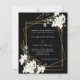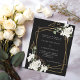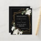 Para um casamento no inverno clássico. Um fundo preto decorado com flores brancas e uma falso estrutura geométrica dourada. Personalize e adicione seus nomes e detalhes. 1 folha = 1 convite impresso de borda a borda.