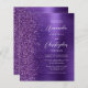A borda esquerda deste convite de casamento moderno e elegante apresenta uma borda de glitter roxo falso. O texto personalizável combina caligrafia branca, copperplate e fontes itálicas em um fundo de metal polido roxo falso. O verso apresenta um design de glitter e metal polido correspondente.
