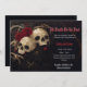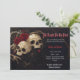 Um convite de casamento elegante e gótico com crânios e rosas.