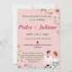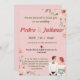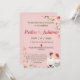 Convite de casamento com um quadro de primavera cor-de-rosa pincelado Estes convites para casamentos florais elegantes de primavera contêm detalhes especiais para a sua festa de casamento de flores cor-de-rosa e folhas verdes exuberantes. Personalize seus convites de casamento cor-de-rosa adicionando seus nomes e detalhes de casamento. O convite para o casamento da primavera refletiu-se num fundo rosa. Perfeito para casamentos de primavera e verão, casamentos de jardim, etc.
