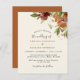 O convite de casamento floral laranja de outono apresenta uma borda superior de marsala bordô em flor, flores laranja escuras e rosa branca, com exuberante folhagem e vegetação botânica, galhos rústicos bordô sobre o fundo marfim. O verso deste convite de casamento é laranja escuro.
