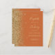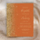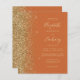 A borda esquerda deste elegante convite de casamento moderno apresenta uma borda falsa de ouro. O texto personalizável combina manuscrito pálido de cor dourada, fontes copperplate e itálico em um fundo laranja queimado. O verso apresenta uma design de cor laranja queimada e ouro correspondente.
