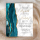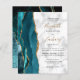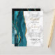 A borda esquerda deste elegante convite de casamento moderno apresenta uma cor azul-lacrimogênea agata borda com falsa brilho dourado. O texto personalizável combina manuscritos dourados com fontes em preto e itálico em uma cinza e fundo de mármore branco. O verso apresenta um design de chaleira e de agata dourada.
