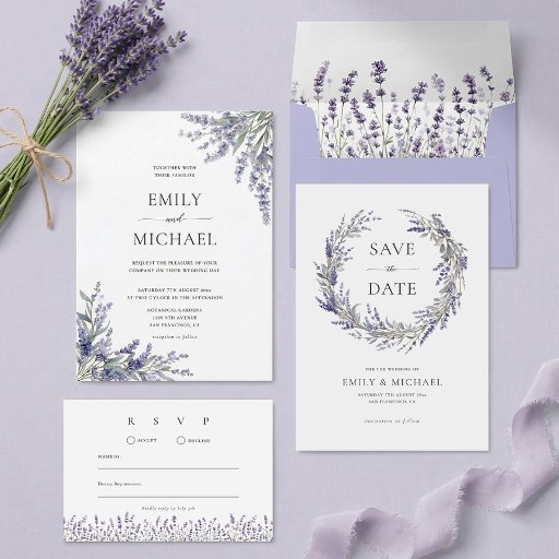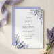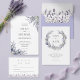 Celebre sua união com este convite de casamento floral roxo. Ele apresenta ramos de lavanda em aquarela com folhagens contra um fundo branco moderno. Este design é ideal para casais que planejam uma cerimônia de jardim simples ou um tema romântico do interior da Provença francesa.