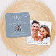 Cartão de resposta de casamento elegante azul poeira com "rsvp" em uma fonte branca elegante com floreios. Insira o endereço do seu site de casamento para criar um código QR para os convidados lerem e responderem online. A parte de trás apresenta sua foto sobreposta com seus primeiros nomes e data de casamento unidos por um coração.