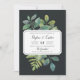 O convite de casamento botânico da Vintage mostra seus detalhes de casamento organizados exclusivamente em blocos escura e caligrafia, contra folhas de cor verde-d-água pintada, galhos, samambaias e folhagem. Um rico fundo fora do preto adiciona um apelo dramático. Convites invertendo para pastel sólido verde.
