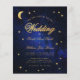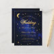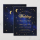 Um convite de casamento econômico com tema de casamento celestial, com estrelas douradas e lua crescente em um fundo azul de noite estrelada. A palavra Casamento e os nomes são escritos em uma fonte caligráfica elegante. A lua e a palavra Casamento são em folha de ouro falsa, o restante do texto é dourado. No preto, há apenas a lua e a estrela em um fundo azul de noite estrelada.