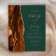 A borda esquerda deste convite de casamento moderno e elegante apresenta uma borda de ágata em tons de laranja queimada e ferrugem, aparada com brilho falso dourado. O texto personalizável combina caligrafia dourada, fontes copperplate e itálico em um fundo verde esmeralda escuro. O verso apresenta um design correspondente de laranja queimada, ferrugem e ágata dourada.
