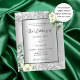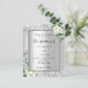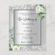 Fundo de aspecto fino prateado decorado com flores brancas, flores, verde eucalipto e brilho falso prateado, faíscas. Personalize e adicione seus nomes e detalhes do casamento. Letras negras.