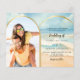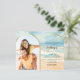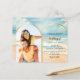 Um convite de casamento para cartazes de praia/destino Na frente: adicione sua própria foto vertical. Praia de cor d'água e ondas como fundo, texto preto. Personalize e adicione seus nomes e detalhes. Voltar: você pode adicionar mais texto se quiser. Vá para a ferramenta design e adicione à camada traseira. 1 folha = 1 convite impresso de borda a borda.