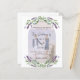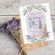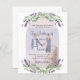 Um fundo branco decorado com flores lavandas, verde de eucalipto e um quadro de arco para sua foto. Personalize e seus nomes e detalhes. 1 folha = 1 convite impresso de borda a borda.