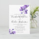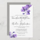 Um bonito convite floral com orquídeas violetas de aquarela e os nomes da noiva e do noivo em letra escrita de cinza escura. O reverso da placa está em cinzas sólidas.