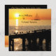 Convite temático tropical sunset com um iate a mover-se ao longo do horizonte em direção ao pôr do sol, perfeito para o casamento na praia
